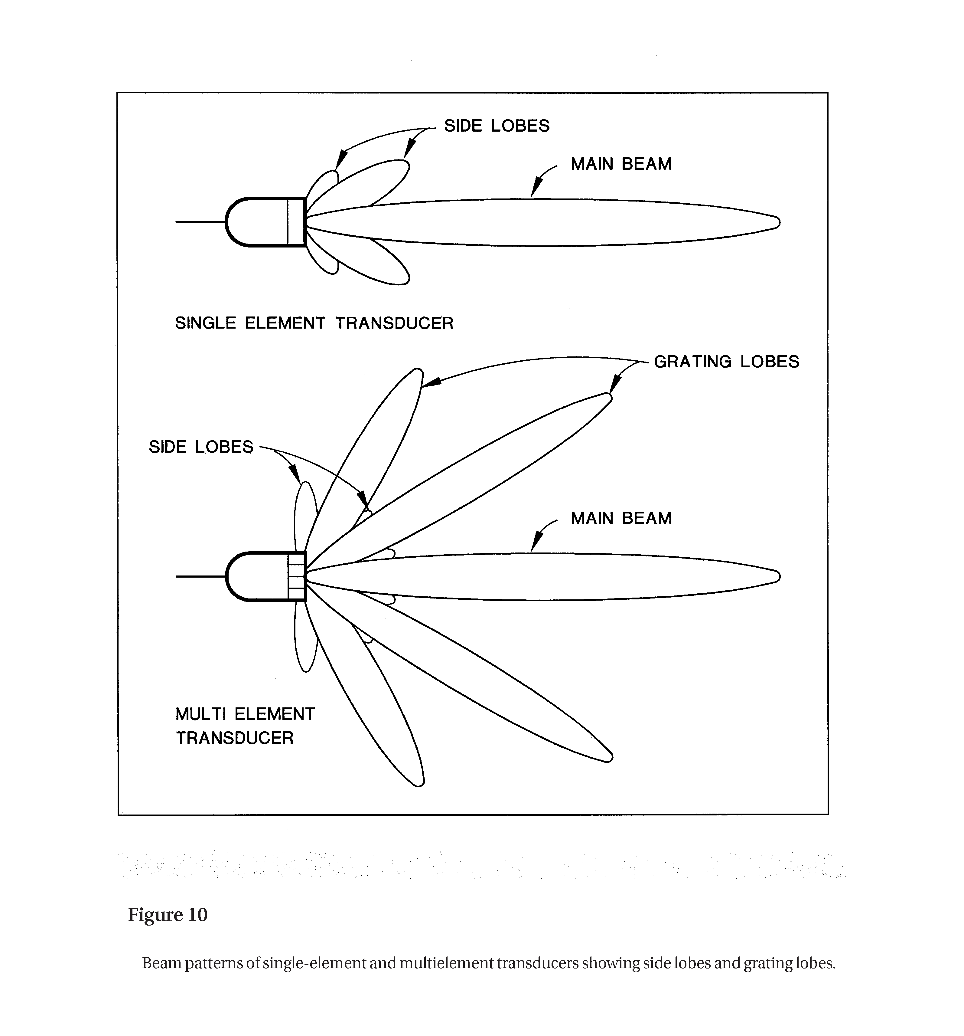 The directed acoustic emission produced by a transducer (see Figures 4 and 10).